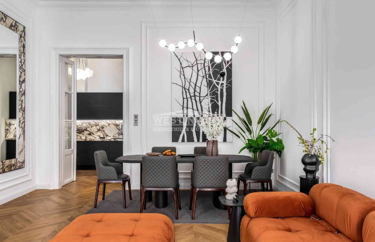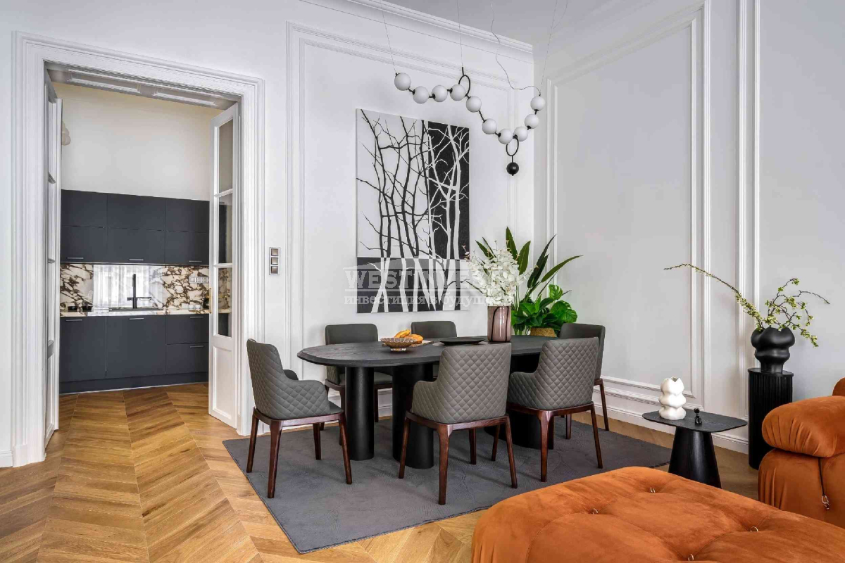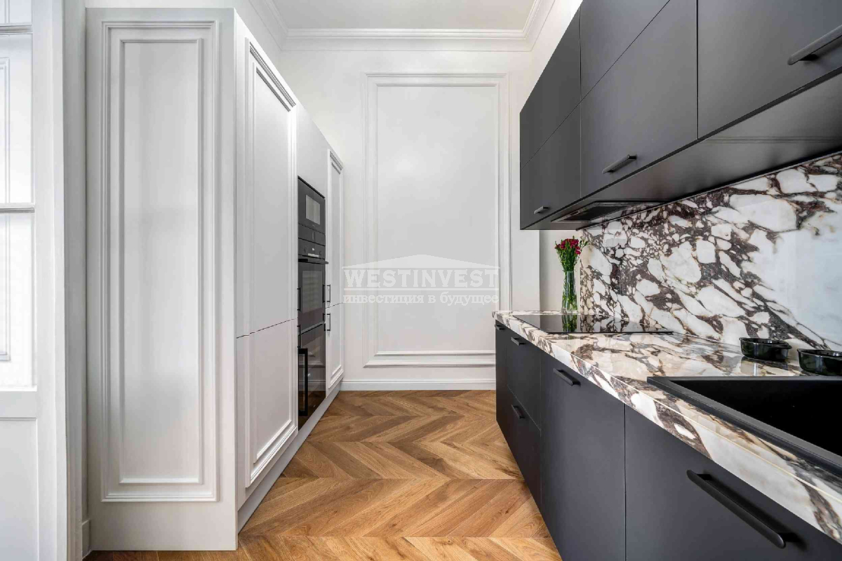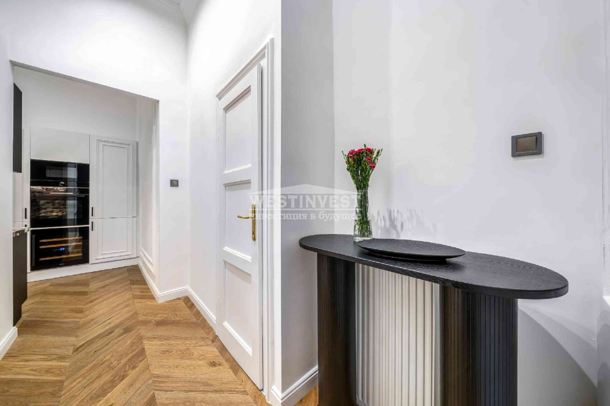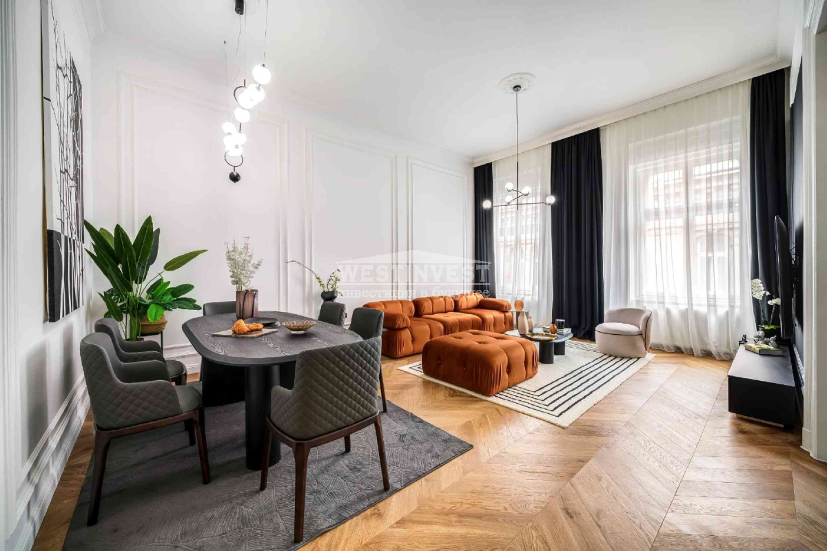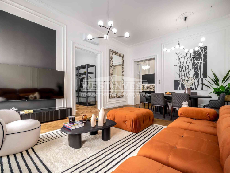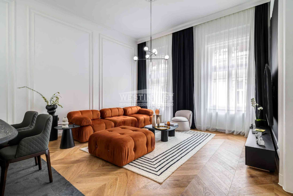 В элегантном доме, расположенном на углу улицы Ваци, одной из самых красивых пешеходных улиц 5 района Будапешта, продается меблированная квартира с капитальным ремонтом, площадью 81 м² на верхнем этаже. Вход в квартиру непосредственно с лестницы. Высота потолков 3,7 м. Квартира полностью отремонтирована: новая электрическая проводка и инженерные системы; дистанционно управляемые жалюзи; звукоизолированные и теплоизолированные входные двери и окна; 3 кондиционера; новое газовое отопление; смесители Hansgrohe; кухонная техника Bosch, холодильник для вина и пр.Ваш агент