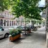 Ухоженная зеленая улица с широким тротуаром и высокими деревьями, до метро - 5 минут ходьбы.
